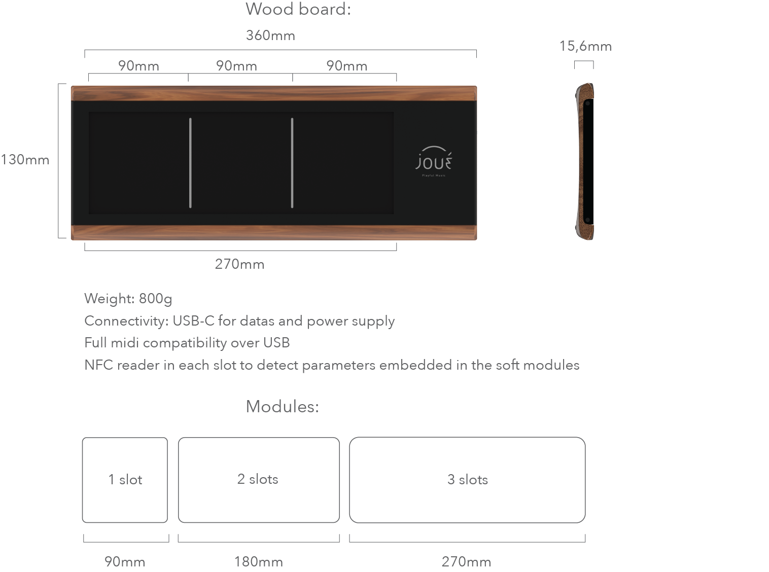 The Joué board is built around a highly sensitive polyphonic sensor that can capture very subtle pressure changes. The Joué board has 3 slots which can be filled by modules.