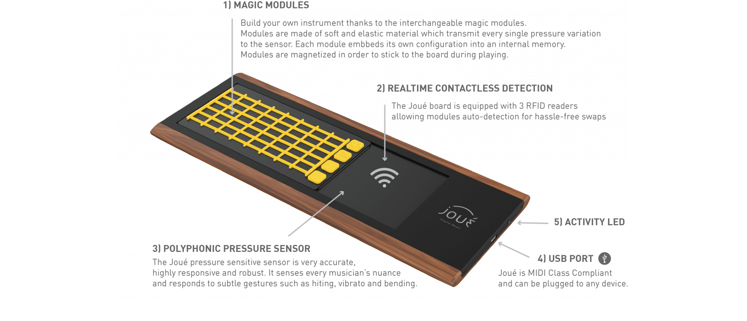 Each slot is equipped with a RFID reader allowing real-time modules detection. Each module responds to vertical, horizontal and pressure movement, and send MIDI data (ie. Control change, pitch bend, etc.) to the connected device. This data is then used by the device or software to trigger sounds, control effects, etc.